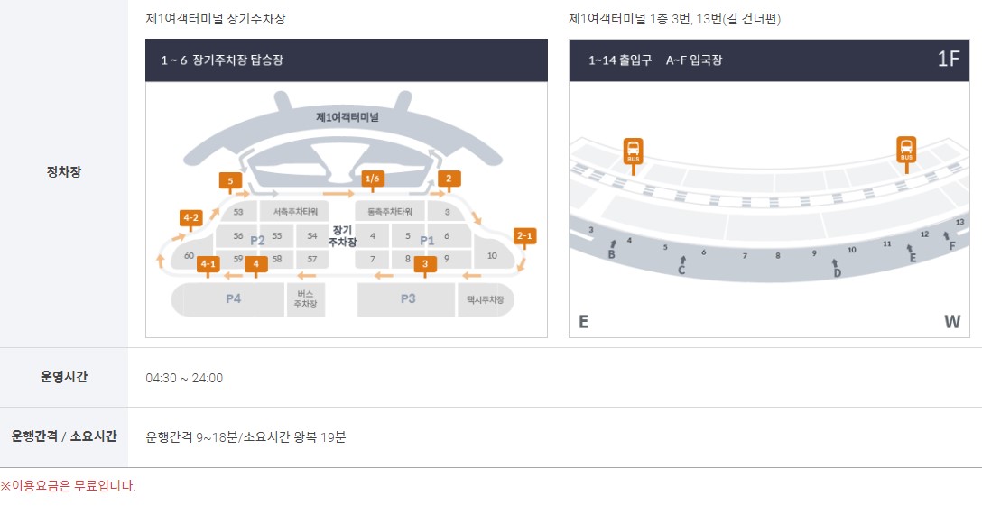 운행시간표를 참고하셔서 이용하시면 비행기 출발시간에 늦지 않도록 수속할 수 있겠습니다.